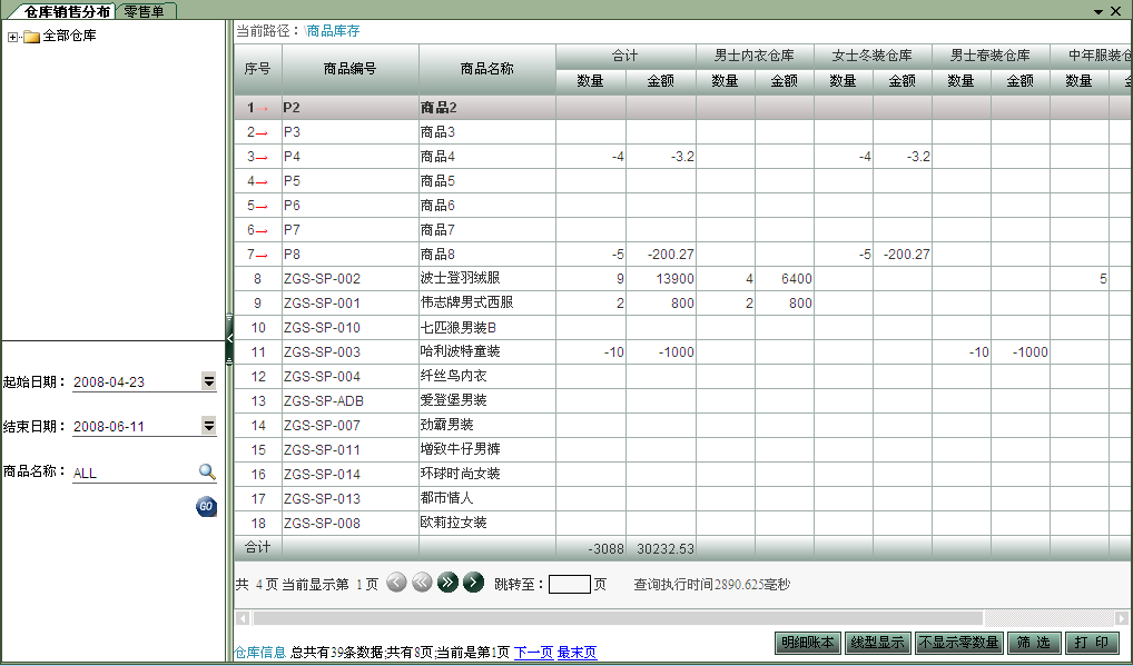 由用戶設(shè)置好查詢時間、商品名稱、倉庫名稱后,按確定,進入報表顯示界面。 界面如下圖: