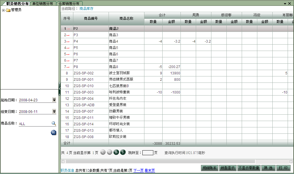 由用戶設(shè)置好查詢時間、商品名稱、職員名稱后,按確定,進入報表顯示界面。 界面如下圖: