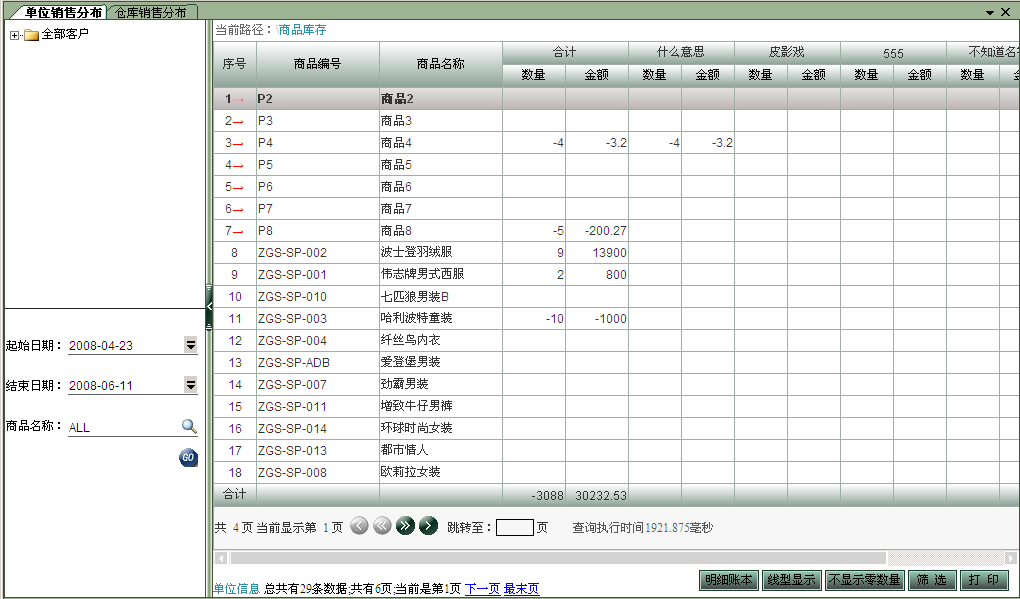 銷售分布表中提供兩種商品的顯示方式:按類顯示和只顯示具體 商品,用戶可根據(jù)需要選擇。